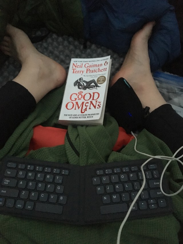 I cling. I put in my headphones and listen, for the third time, to Neverwhere and The Lord of the Rings trilogy and the entire Sherlock Holmes canon. I dive into my favorite podcasts and put on my upbeat playlists and dance across the rocks. At night, I unpack my bag and set up my tent and pull out my copy of Good Omens, Crowley grinning encouragingly at me from the cover. I watch the show over and over, I read the script book. I know the voices; I hear them in my head. Soon, I will have the letters written word for word in the fibers of my heart.