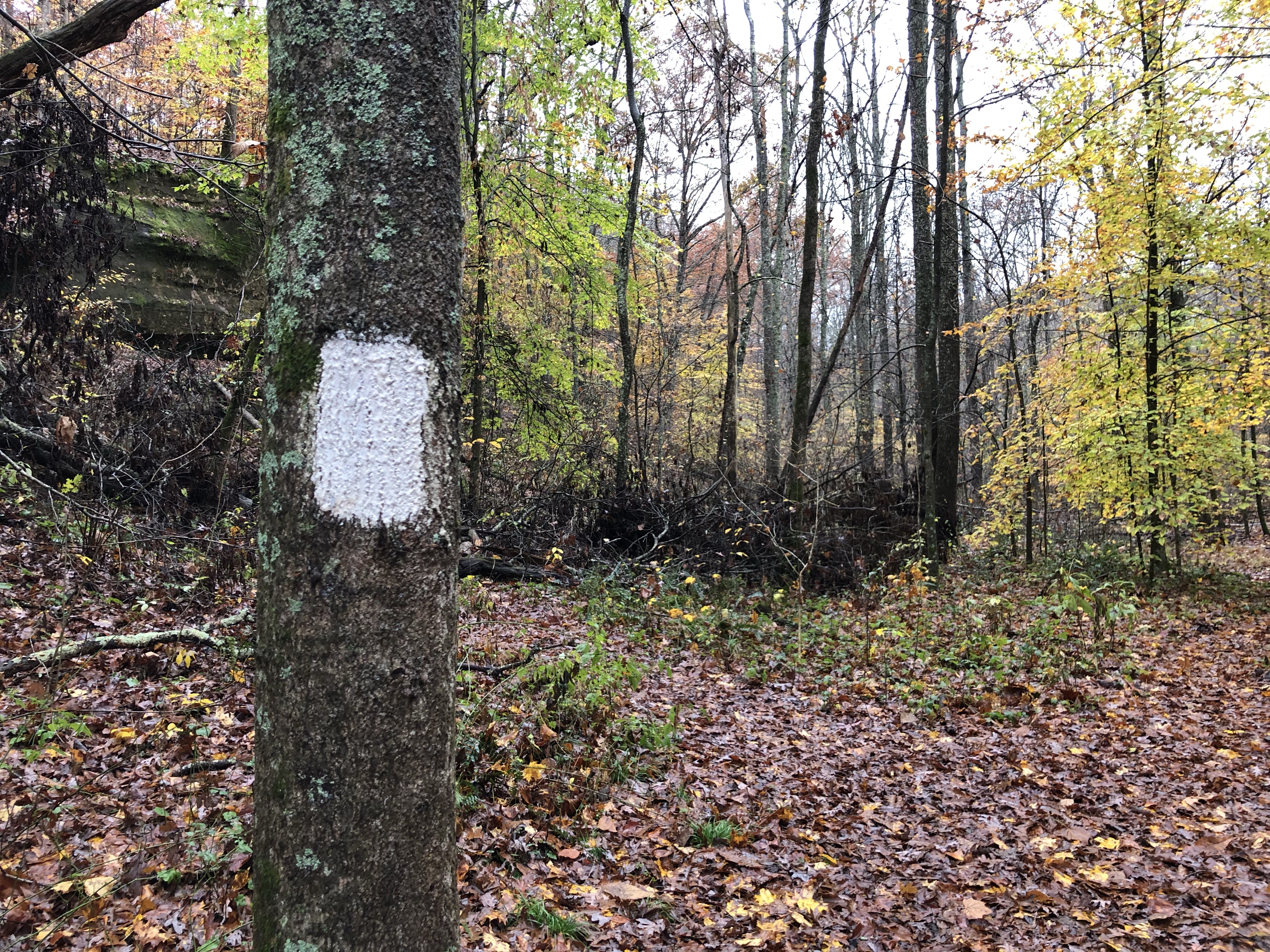 Zaleski looks similar to Shawnee. That’s probably not surprising, considering that both are in southern Ohio, which in late fall is characterized by rolling hills, wet rocks, and deciduous trees in the last throes of autumn colors. But there are fewer ups and downs, and it didn’t really feel all that difficult for the most part. There were numerous caves, waterfalls, rock formations, pretty creeks, and cliffs with views across valleys. We also found a large flush of chicken of the woods growing on a dead tree. It turned out to be past its prime, but I was glad to have finally found some after looking for it all fall.