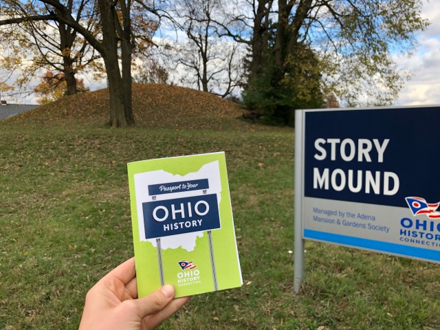 Ohio is positively covered in mounds built by the Adena, Hopewell, and Fort Ancient peoples. Story Mound, according to my passport, was built by the Adena people between 800 B.C. and A. D. 100. I knew it was smaller than other mounds I had visited, but when we rolled up to the pocket park smack dab in the middle of a neighborhood, I realized the scope and couldn’t help but laugh. Then I really laughed when I saw the gate in the fence surrounding the mound: it was padlocked.