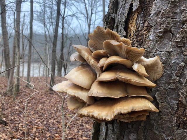It was easy walking, alternating between flat grassy paths through underbrush and thinner, forested trails. At first, the views and the trees were unimpressive, but the trail gave way to clear views down to the lake and became populated with all kinds of trees, including ideal mushroom trees: tulip poplar, elm, oak, sycamore. We found a tree covered in oyster mushrooms, just past their prime – otherwise they would have made a great harvest. Given the density of the elms and tulip poplars, we decided to come back during morel season.