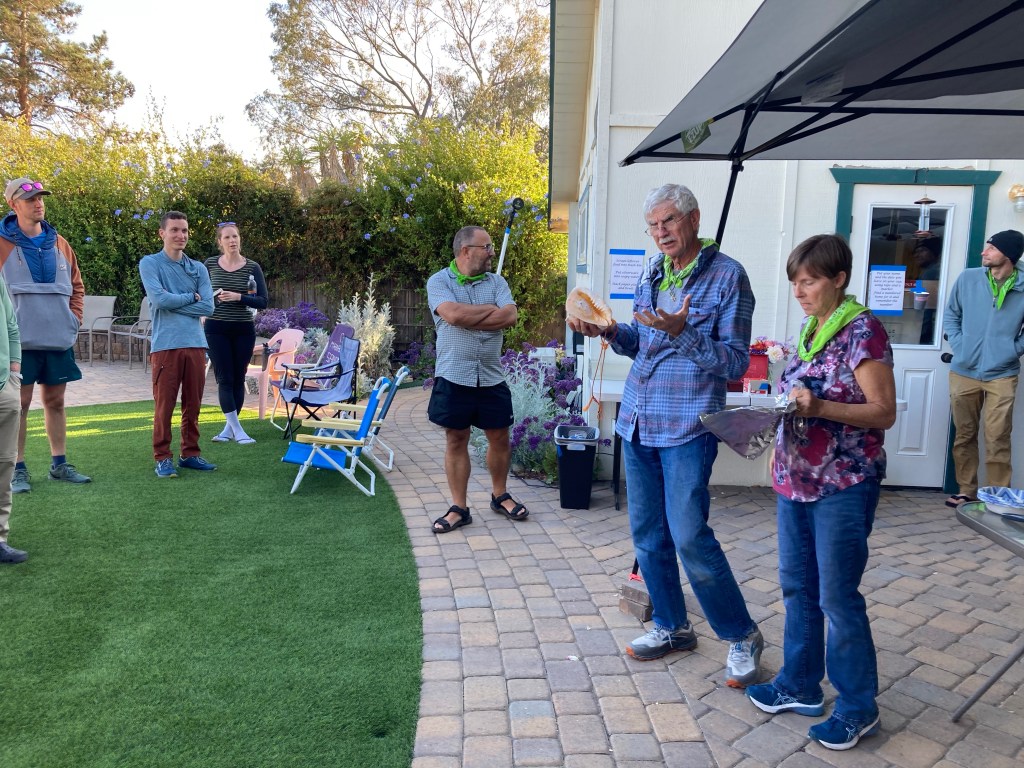 Dinner is at 6, a chicken stew and biscuits with salad. We sit in a circle on the lawn chatting while we eat. A little while later, Scout and Frodo give their customary talk about the PCT, Leave No Trace, and how to be a good trail ambassador. Scout reads a few excerpts from Journeys North, captivating us with his trail tales. It is so surreal to be sitting here.