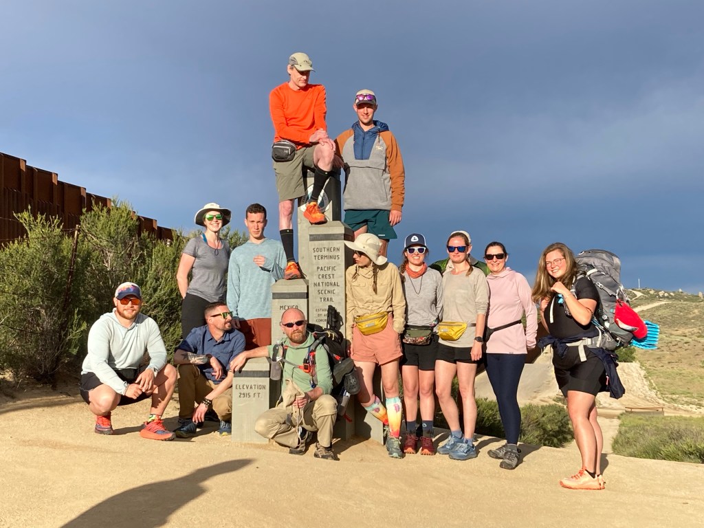 We pack up into three cars. I’m with Frodo and hikers Alex and Vinura. The sun rises as we drive east to the monument. When we get there, the group gathers around Phantom, who gives us a brief LNT recap and distributes our PCT hiker tags. Then we all take pictures at the monument, the little stack of gray columns, sister to the one so far away in Washington, that tells us how far we have to go.