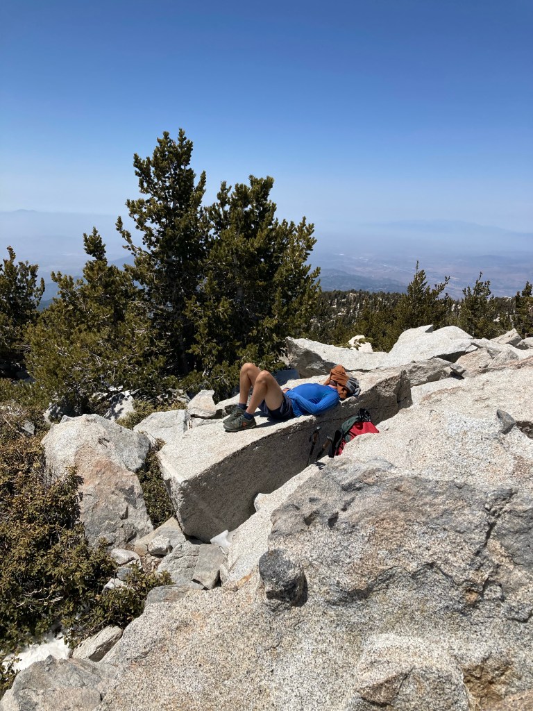 After signing the trail register at the little cabin, we continue, rock-scrambling between snow drifts, until we finally reach the boulder-strewn summit of San Jacinto, where Andy, Beetle, and Petra are chilling (Andy especially. See photo below.)
