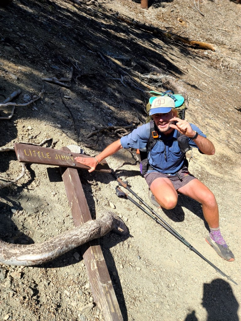 Before long I reach Little Jimmy Spring and fill up my water bag. I check the clock and realize that I could make 10 miles before 10 if I leave right now and rocket down the hill. I really wanted to witness the inevitable Little Jimmy photo shoot with DLT, whose real name is James but who refers to himself in the third person as Jimmy, and who will definitely be very excited about the sign for the spring, but I am determined to make good miles… and to make it to the pit toilet at the trailhead 2.5 away.