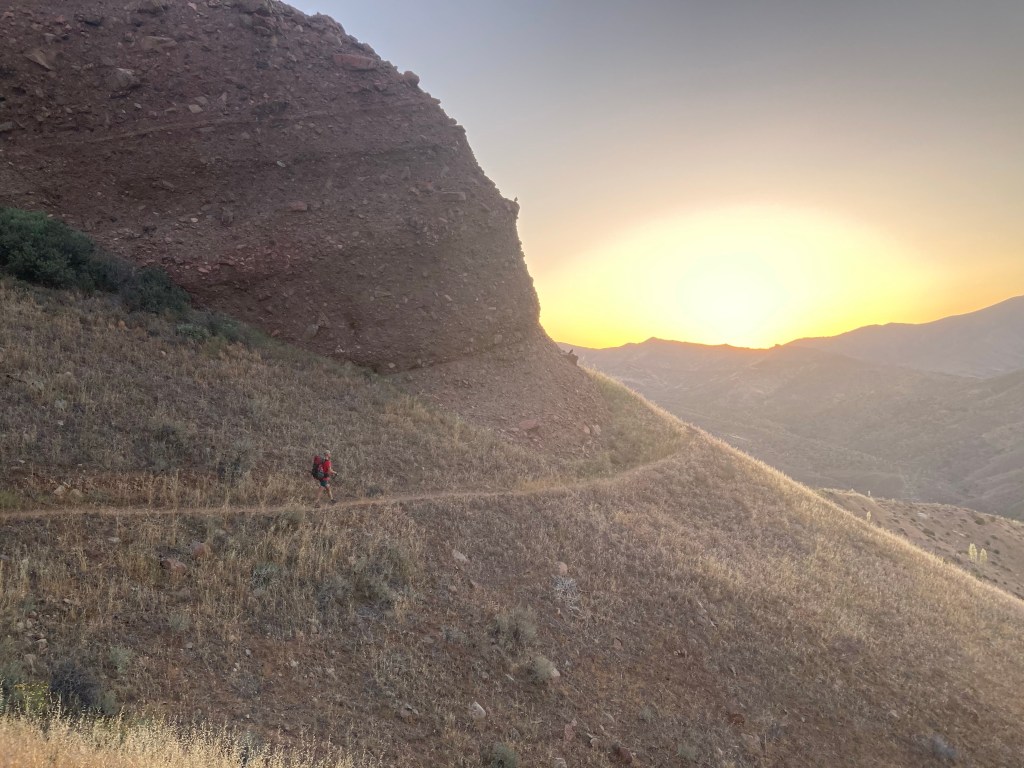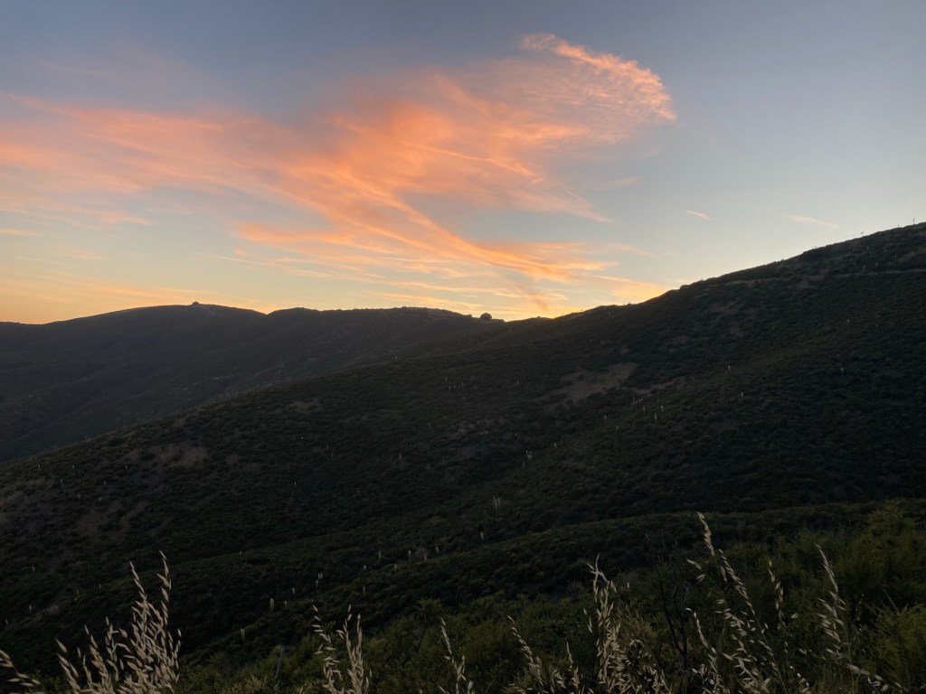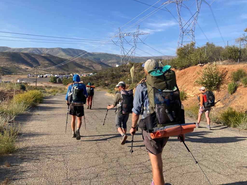 Around 5:00 we get water from a spigot, pack up our bags; and head down the road. It’s two miles of road walking followed by a steady climb this evening. We walk in a big group at first, and then we spread out and I walk the rest with DLT. It seems like we’ve managed to avoid the worst of the heat, but it’s still a steady climb and it takes over four hours for us to get there. On the way, we get to witness a beautiful sunset over the mountains. What is it about the sun in the desert? It’s magic.