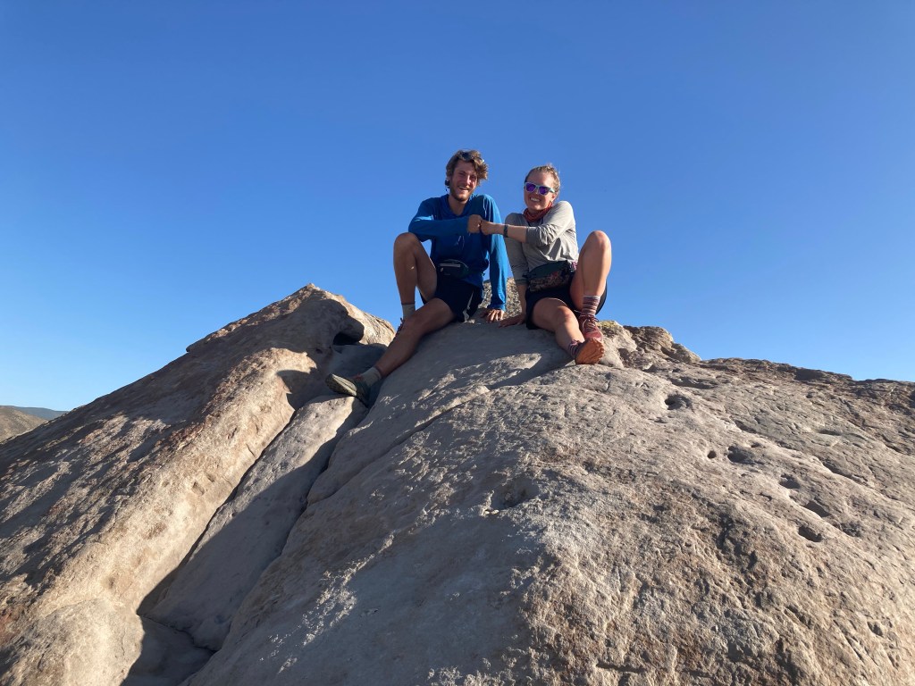 The trail turns upwards and gets really steep for a few moments. We pass a day hiker who tells us about a side trail to the largest rock at Vasquez, so we take this trail instead of the PCT and wind up at the base of the formation. I’ve been here before, but the rock looks even more impressive than I remember. It’s huge and it slices upwards at an angle into the sky. Beetle, Ishay, and I climb all the way to the top. The view is gorgeous, but it’s so hot and we’re just a mile and a half from breakfast at Agua Dulce, so I don’t stay up there for long. I climb back down and follow the group into town.
