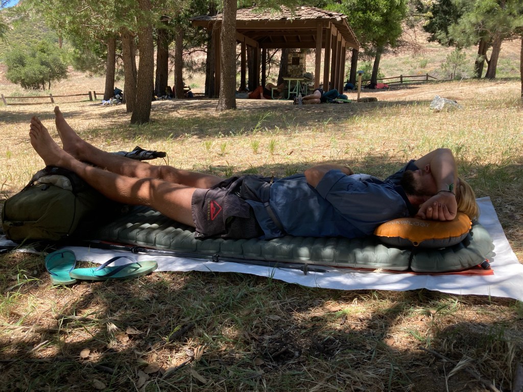 It’s not long before we run into Petra and Catless. We walk more or less together for the last mile to camp, right before Lake Hughes Road. It’s a lovely clearing surrounded by bushes. We set up for cowboy camping in a circle, and soon we’re joined by Power Plant, Knuckles, and Topo. It makes me so happy to be sitting here in a circle with my trail friends beneath the mountains. I eat a Mountain House yellow curry, which is objectively the best backpacking dinner I’ve ever had (shoutout to Andy for discovering his gem), followed by some dried mangoes for dinner. Backpacking, man. It’s the simplest and most beautiful thing.