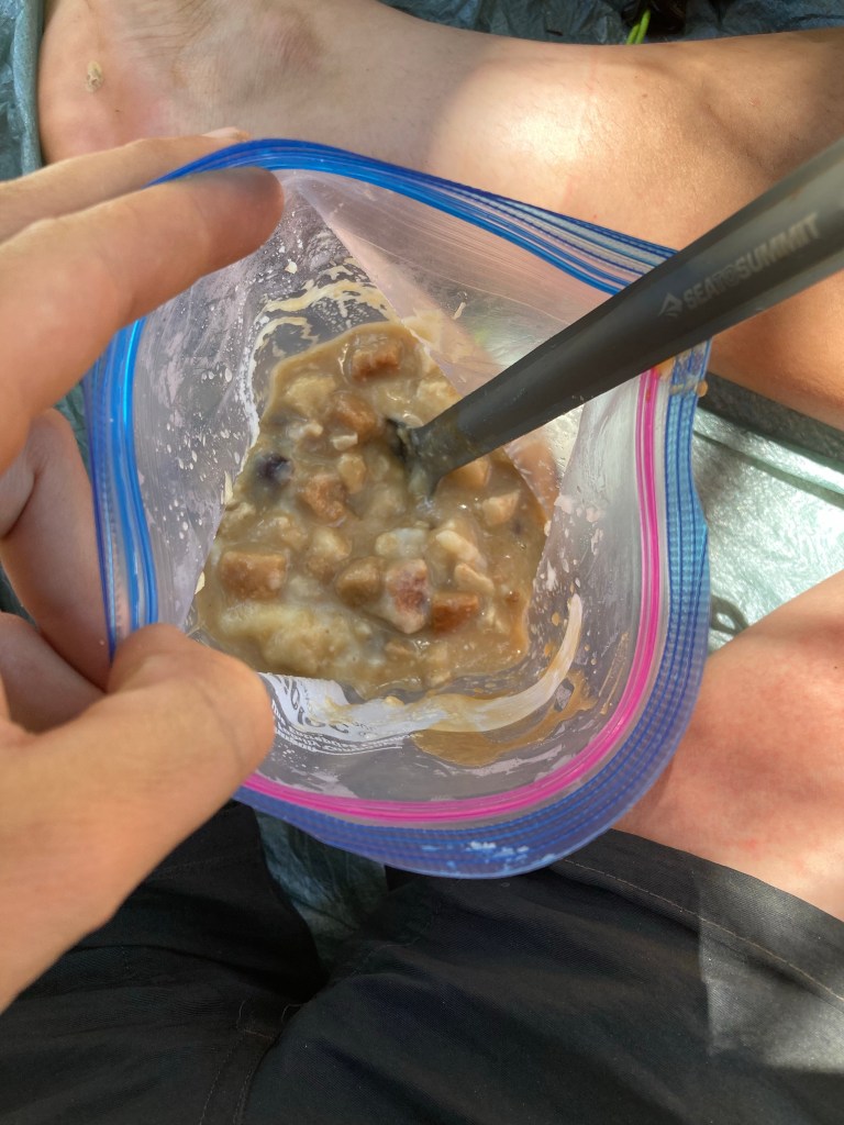 I set up for nap time under a pine tree and pass out almost immediately. When I wake up, there’s a huge group of sleeping hikers spread out all over this area. That’s how you hike when it’s stinking hot, I guess: big miles in the morning, fat nap, more miles at night. I’m hungry again when I wake up, so I make one of my pre-packed Thanksgiving dinners that I put together before I came out. It’s very heavy and gross-looking, but it tastes amazing.