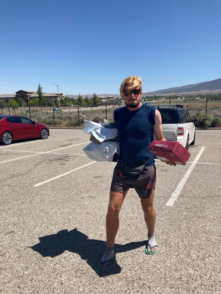 After lunch, Beetle drives us to the post office (this feels so weird to write) in the car that Judy let them borrow. DLT has seven packages to pick up, which tracks with everything about his personality. I send a few postcards by physically handing them to the worker because I don’t trust mailboxes anymore after losing so many of my letters. DLT tries on his new merino sun hoodie right in the middle of the post office next to his huge pile of packages, deciding that the large fits better. Once that’s sorted, Beetle takes us back to town.