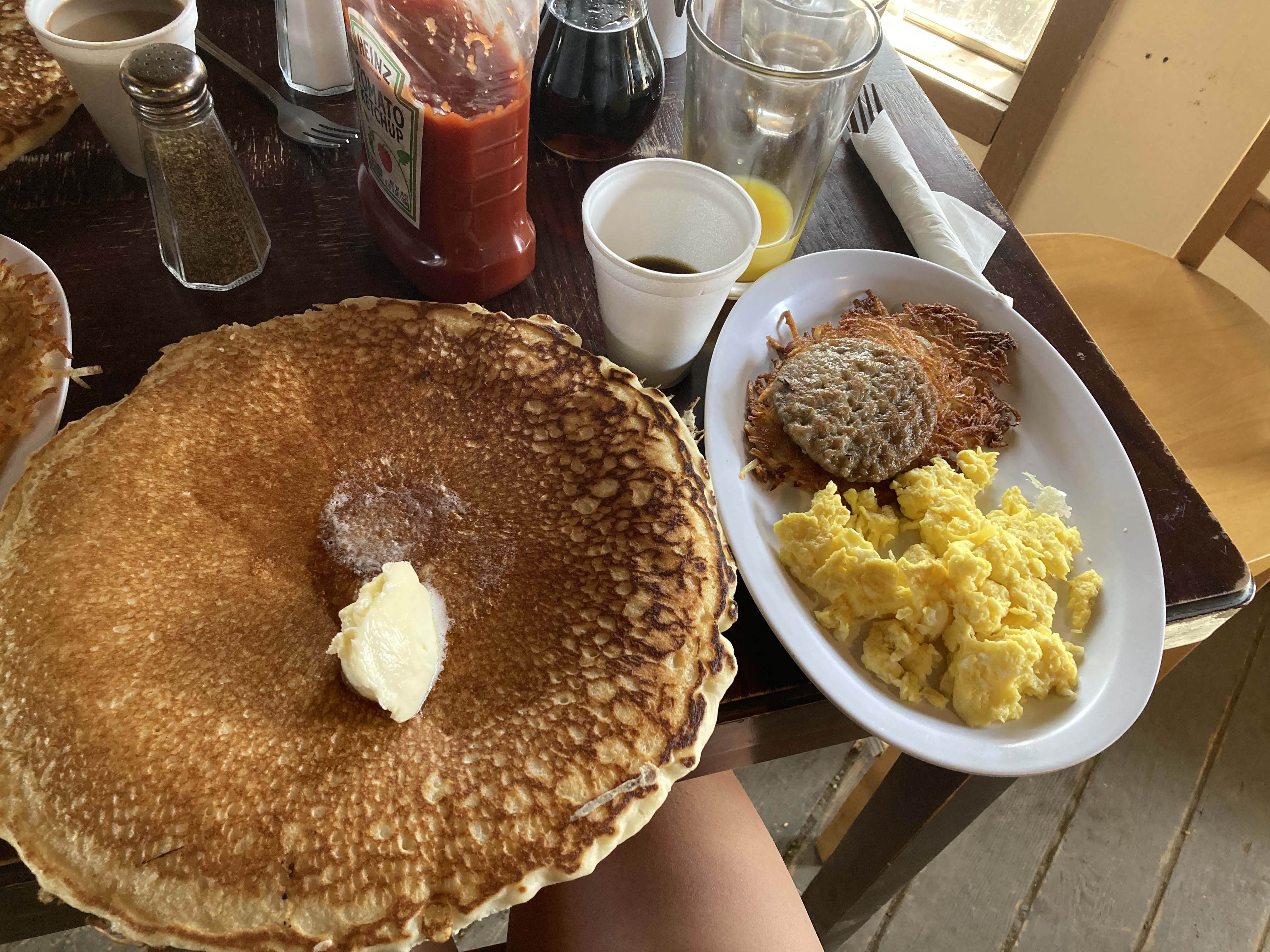Before I know it, it’s close to opening time and the deck is full of hungry hiker trash waiting for breakfast. The doors open and I rush in with Catless and DLT. We order the hiker breakfast: sausage, eggs, hash browns, and the most massive pancakes I’ve ever seen. They’re supposedly endless, but I don’t think many hikers have ever gotten through more than one. When we finally get ours, they spill off the plate and are topped with a huge scoop of butter. I can’t finish one, but the three-quarters that I do consume are a delight. I sit there for hours drinking coffee after coffee, writing, checking email, and being on social media. (Naturally, DLT is stoked about bottomless coffee and has at least 5 of them, into which he pours maple syrup, because he is the way that he is.)