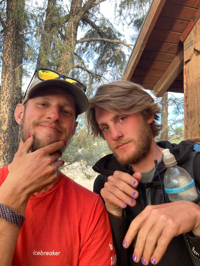 Back at the restaurant, I hang out with the tramily, the step tramily, and various other folks hanging about. Someone has produced two bottles of nail polish, one purple and one red. I still have the remnants of sparkles on mine from Tehachapi, and I paint over them with purple. It’s chunky, but it will work. Beetle gets his nails painted purple, and Andy opts for red. True fact: you must have painted nails before you enter the Sierras. Sorry, I don’t make the rules.