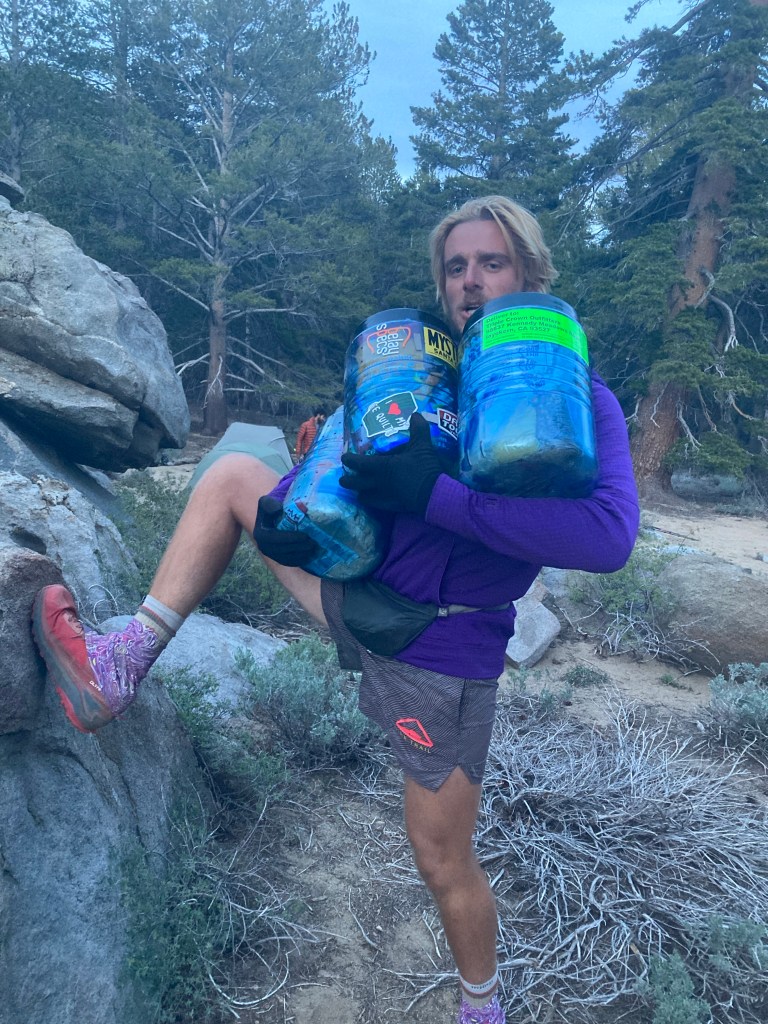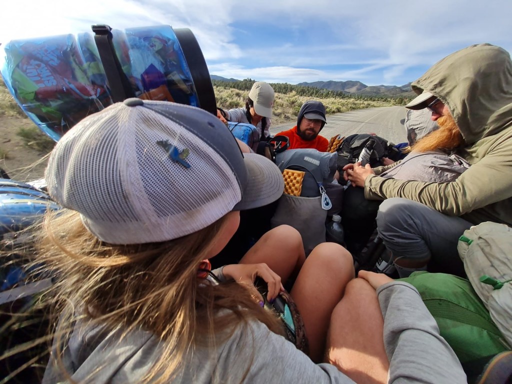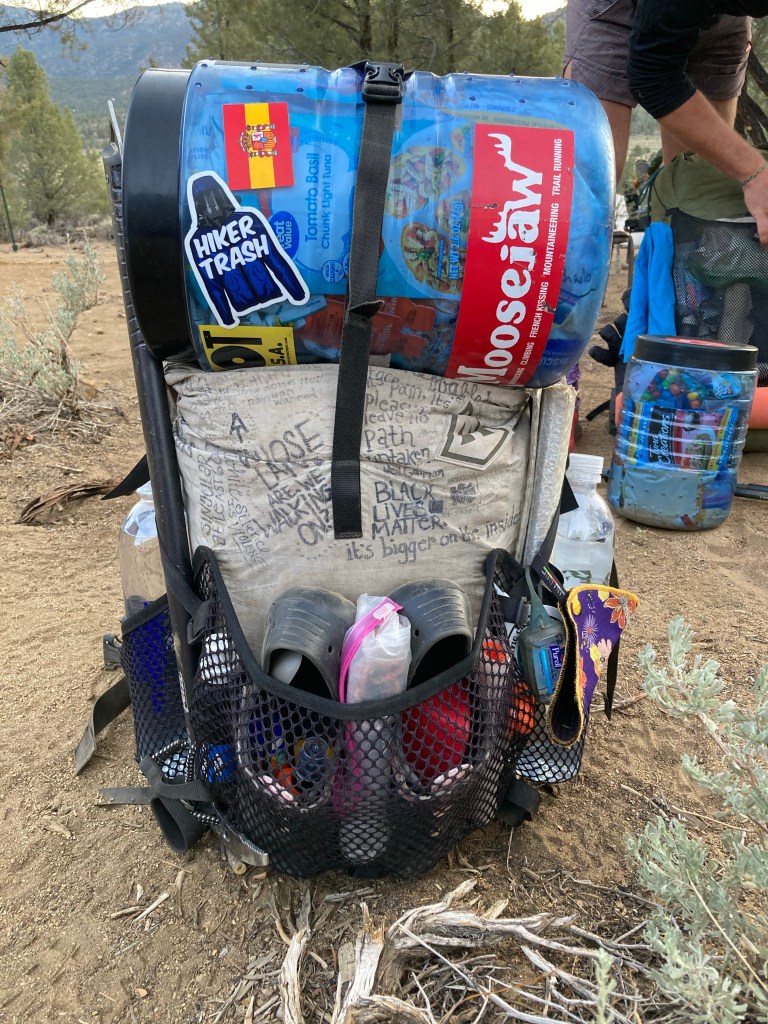Morning is a flurry of packing, eating breakfast out of the hiker box, coffee drinking, and using the bathroom at Grumpy’s on more time before we head out into the mountains. I manage to fit my ice axe and bear canister on my pack, and while the weight of it is much less than the pack I took into the Sierras in 2017, it’s still much heavier than I’m used to in the desert. Oof. This is going to hurt.