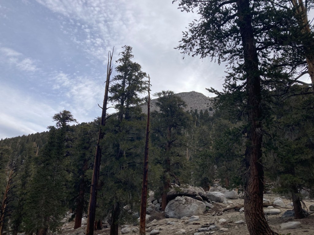 We finish the hill we started last night, and so far, it’s a lot easier than it was while I was running on empty. To the left there are so many rocky granite snow-capped mountains. We are really out here! It is real! At the top of the hill we re-enter the forest. It is coniferous on top and rocky on the bottom and it looks exactly like Cottonwood Pass, where I started the JMT/Nüümü Poyo five years ago. I wish I’d studied my plants better. All I know is that these are not pines. Firs, maybe? Douglas firs? They are towering and their bark is swoopy and I love them. Through the trees we can see Olacha Peak, and then, to the left again, we spot Tumanguya, Mount Whitney. So close. I cannot believe that I’m here again.