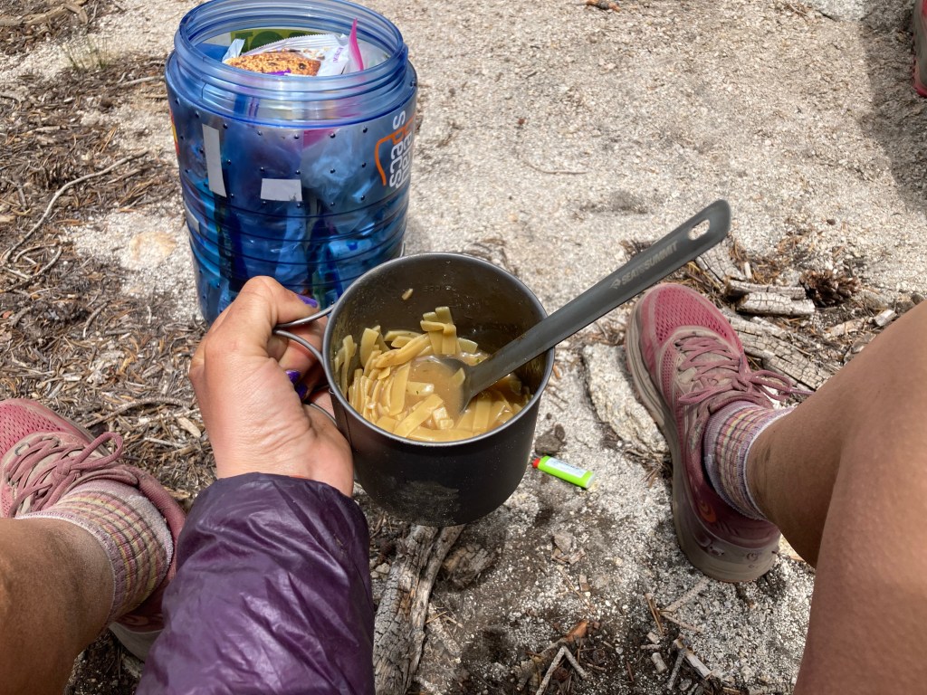 I actually feel pretty good as I start moving up the hill. The higher I get, the more I can see: Olacha peak behind us, and the rocky hill ahead. Up, up, up. For the first bit, I’m okay without music. Then I listen to “Long Lost” by Lord Huron, which has been stuck in my head for days (“Send me to the mountains / Let me go free forever…”), followed by the album An Awesome Wave by Alt-J, which is synonymous with hiking for me. I’m in the middle of “Matilda” when I pass next to a rock and see DLT and Catless pulled over for lunch. It’s earlier than we were planning on stopping, but they’ve found an amazing view out towards the true Sierras, including Whitney. I plop down, boil water, and make a stroganoff Knorr side. We’re trying a new strategy: cook the big meal in the middle of the day and eat something lighter for dinner. Hopefully this helps me avoid crashing like I did yesterday.