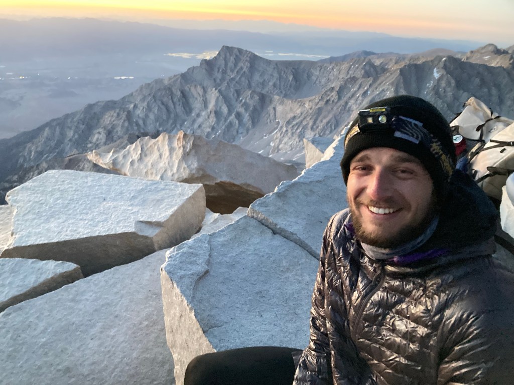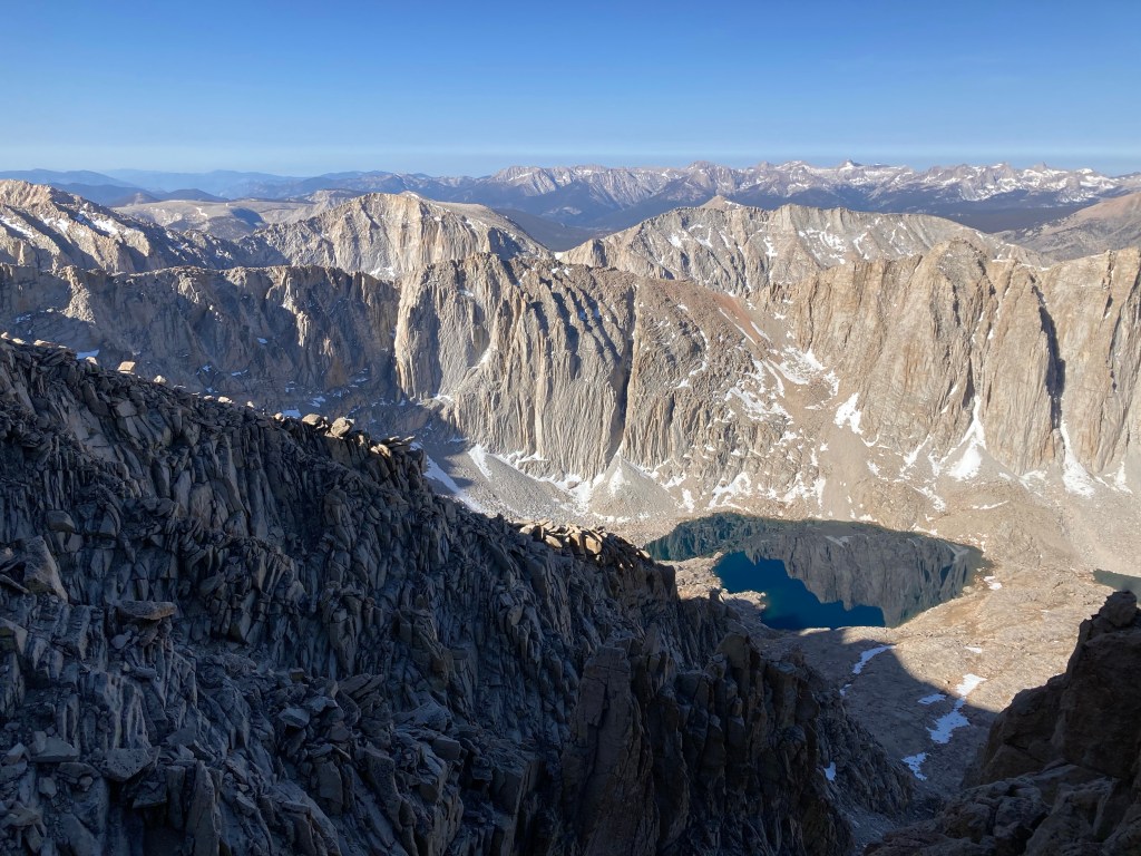 At the junction with the trail down to Whitney Portal, things start to get rocky—literally. The path goes from easily walkable to the surface of an alien planet. We walk along a ridge navigating irregularly shaped rocks as we pass the Needles and the windows where, during the daylight, one can see down to the Owens Valley and Lone Pine in the distance. It freaks me out. I’m starting to get dizzy, and every breath is an effort. I try to concentrate on my foot placement so that I don’t fall. It seems like we’re getting close to the summit, but then we see headlamps still on the side of the mountain far in the distance.