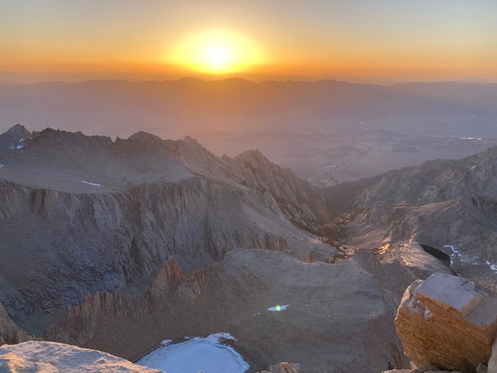 I join Catless and Jumbo on a rock right at the top of the summit. The horizon is the faintest color of orange, with a deep blue layer on top. It is very, very beautiful. I get out my sleeping quilt and wrap it around me. Jumbo gives me his jumbo winter gloves, but my hands are still icicles. Somehow, neither of them is in their quilt. I can’t understand it; I think I might actually freeze up here. But the sun is coming up now, slipping softly from its bed and into the sky, and the light it casts on the mountains to our right and left is heartbreaking and gorgeous, and I can’t believe I’m here on this sacred mountain again, and I love my imperfect little dizzy body that got me here and the God that is everywhere among these hikers facing the coming of the day.