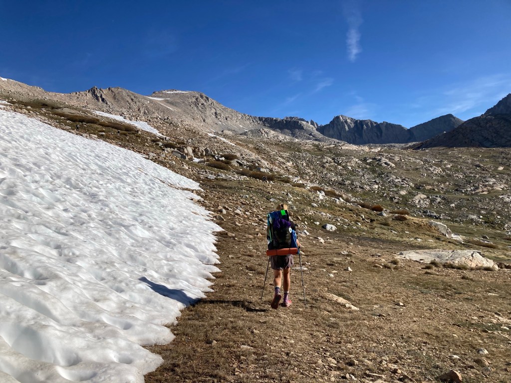 The morning is surprisingly hot. We catch up with Catless after he sheds his puffy, and then the three of us walk together towards this infamous pass, the highest point on the PCT. I remember it clearly from the JMT, and I know from experience that it is far from the hardest of the passes and that we will have plenty of time to get up and over it before lunch. We start out fast, then slow down as Jumbo starts to wilt in the blazing sun. Despite the heat, there are snow fields everywhere that we have to navigate, which mostly involves going off-trail until we find the PCT again.