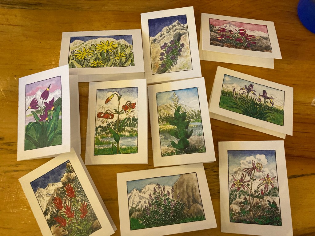 I go into the bookstore Spellbinder while Jumbo and Catless go to the brewery. I talk myself out of buying books (my resupply will already be way too heavy), but I do get an adorable little pack of cards with different Sierra wildflowers on them. They have all my favorites: sky pilot, columbine, paintbrush, lupine. Then I go to meet the boys at the brewery for a Kolsh. Jumbo and I run to the post office to send some postcards and, in my case, a collection of things I don’t want to carry anymore. Farewell for now, birthday crowns and decorations! I’ll see you in three months.