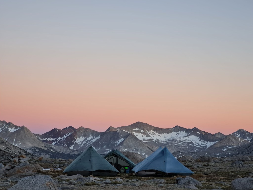 We all eat dinner in our tents (an in-tents dinner, if you will) because it’s so cold. The mountains are beautiful, though, and Jumbo gets out to take a stellar shot of our three Duplexes in this basin beneath Mather Pass. I’m tired, chilly, and worried how I’ll sleep tonight, but I know I’m with good people, my bear can is slowly getting lighter, and everything is going to be just fine.