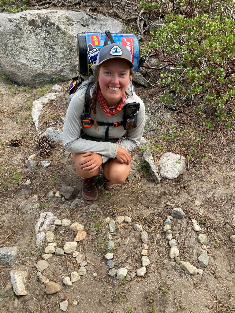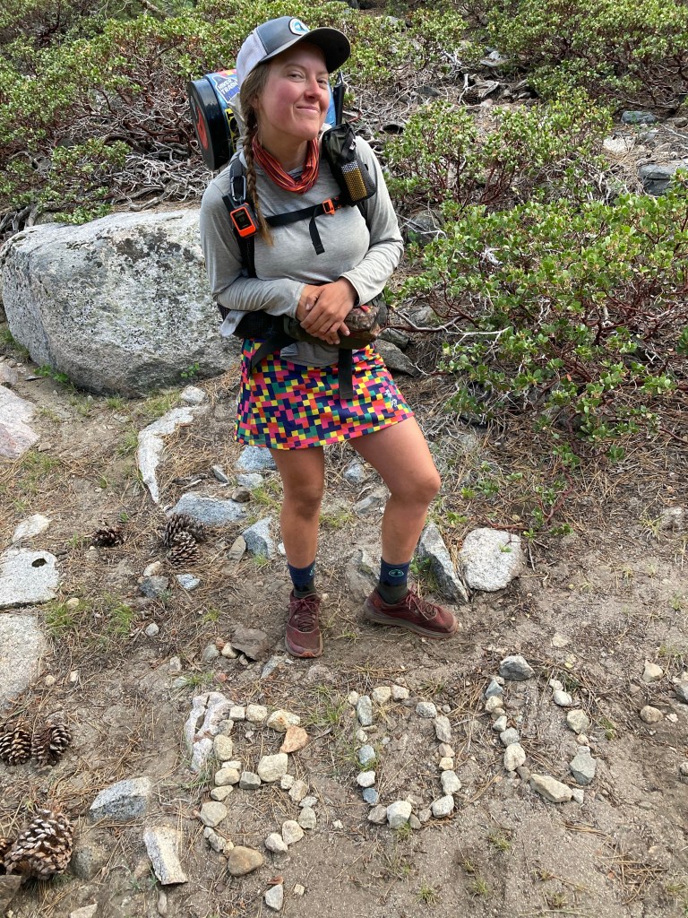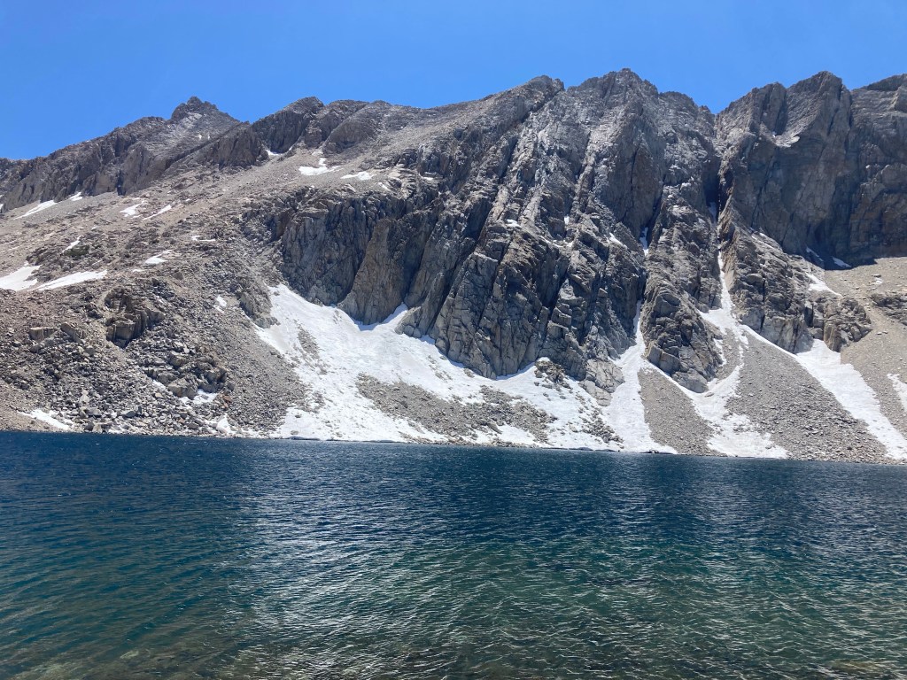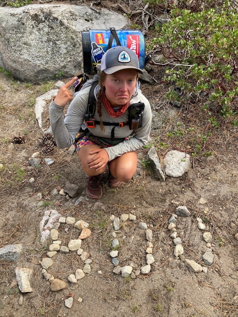 The rush to pack up combined with remembering how terrible I felt last night does not put me in a great mood. Everything feels like it’s taking forever, and it’s kind of gray and sad this morning. I don’t remember that from the JMT. It was always lovely in my memory, but then again, I didn’t do it in June. I feel like I have to do a cathole, but it’s a false alarm. I haul my pack and my bear can up to the bear box where Catless and Jumbo are waiting, then I throw everything on the ground and get my extra food (I still have food that won’t fit in the canister, good god) out of the bear box. I really don’t want to hike. I don’t want to suffer like I did yesterday. Dramatically, I curse, “I fucking hate hiking,” then try to shove everything into my bag while fighting tears.