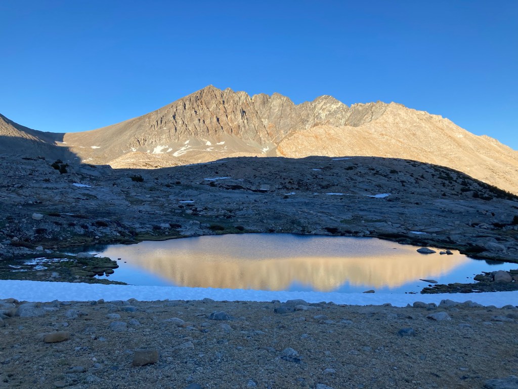 It’s warm when I wake up, which is a pleasant surprise. It’s also 3:45, which is less pleasant. I groan and get out of my tent to pee, then have to re-inflate my air mattress before I sleep for another hour and fifteen minutes. I snooze my alarm and wake up for real when I look over and Jumbo’s tent is gone. I hear him packing up and panic. Ah, shit. At least I slept really well. So far the Sierras have been helping me out with that at least.