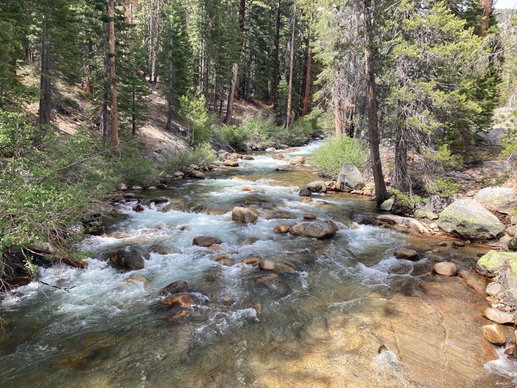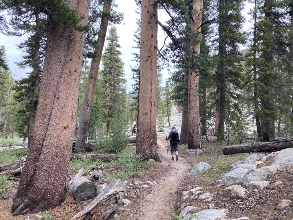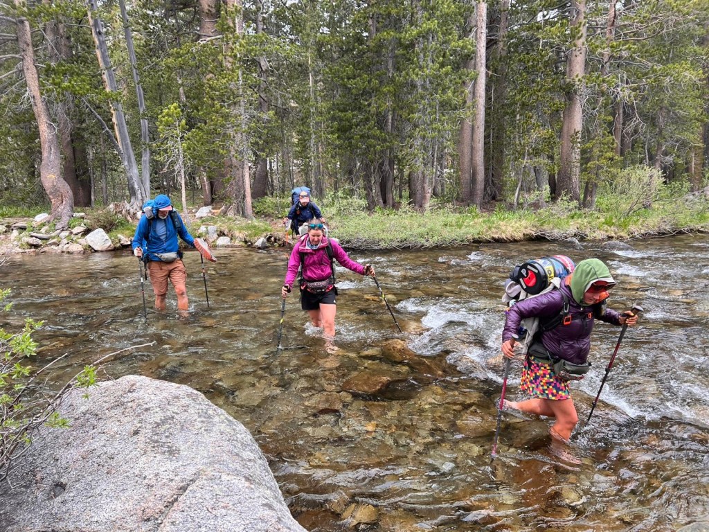 We wind our way downhill into a lovely meadow, then further through the trees until we reach Bear Creek. I don’t remember this crossing, and I realize when I look at the Far Out comments that this is because we took the alternate in 2017. It doesn’t look too bad this morning, but the very idea of walking all day in weather like this with wet socks is so depressing that I switch to my camp shoes. (Thank goodness we all got those Tevas in Bishop!) The minute I step in the water, my breath literally catches in my throat. It’s freezing. I don’t know if it’s the weather or an actual difference, but it feels much colder than Evolution did. By the time I’m across the ford, my feet are painful icicles. I take deep breaths and try to calm down as I go farther down the trail, dry off my feet, and put my hiking shoes back on. Thankfully, all the crossings for the rest of the day are rock hops or logs, so my feet stay dry the whole day.