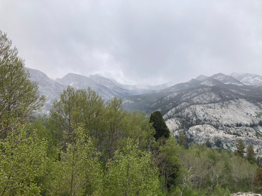 We’re all moving slow today, even Jumbo. We all agree that we are simply out of cheese. No cheese legs for these bois today. We walk together, taking turns being the strongest goose. The trail starts to climb up towards the Bear Ridge Trail junction, and we suffer. The switchbacks aren’t quite as bad as the ones going up to Selden, but they are steep. As we’re trudging vaguely upwards, we notice some clouds rolling in, then we see flakes. It is… snowing! In June? No thanks. Thankfully, it doesn’t last long, and there are only a few little flurries. We book it up the rest of the hill, then find a protected spot to have lunch. Since we’re all pretty good on food now, we can eat a good amount. I go for baby red mashed potatoes and tuna with the rest of my chip drink. Peak gourmet right there.