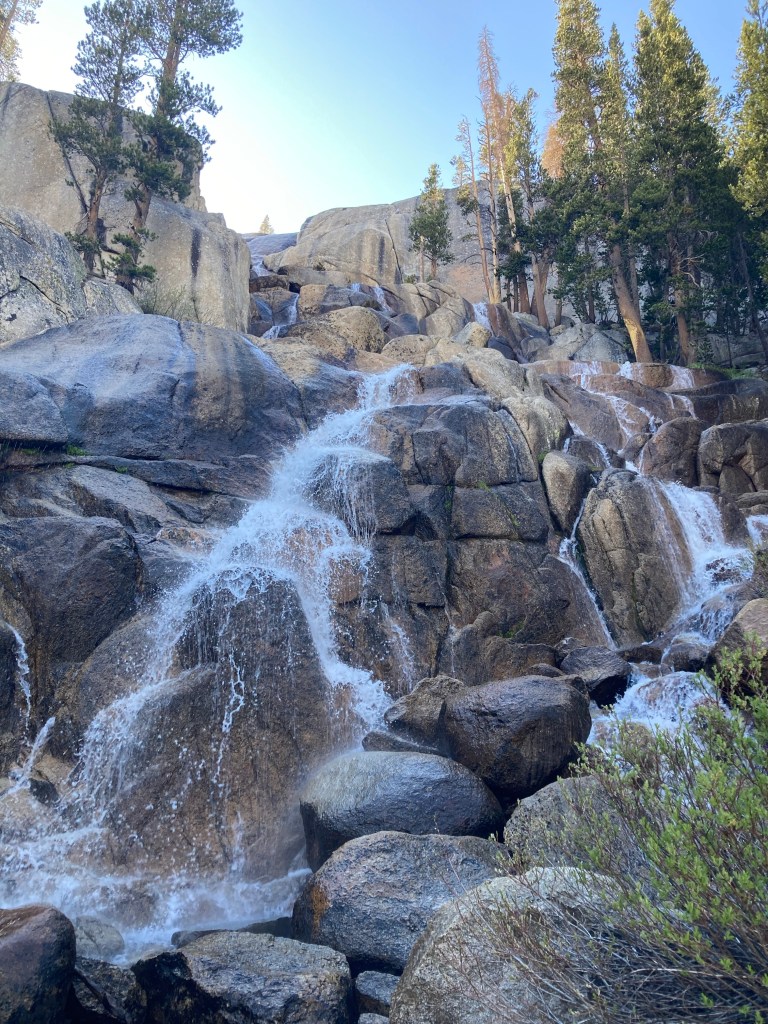 It’s a lovely afternoon. The trail wanders through more forest with towering granite walls in the background. We ford the North Fork of Mono Creek, climb some more, then walk over the rocks at the Silver Pass waterfall. We are all out of cheese. Completely devoid. We finish the climb and wind up near a meadow with a flowing stream. We set up camp when we reach the site we were aiming for—and before 6, no less!