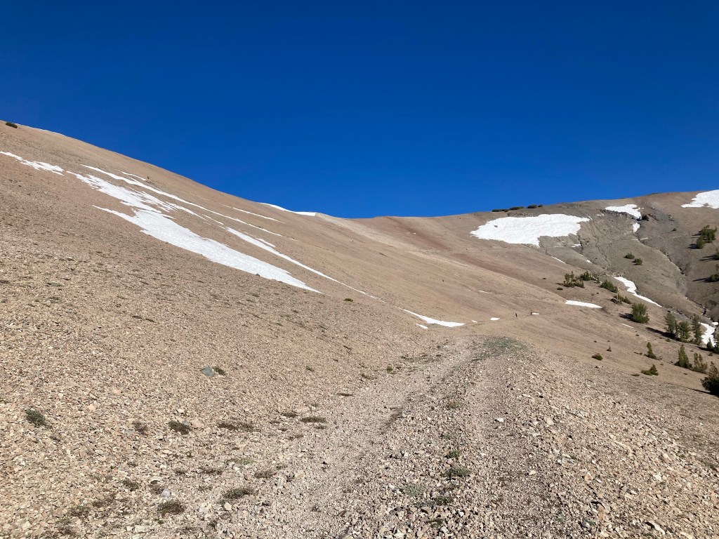 I ignore it for as long as I can, but ultimately, I have to dig a cathole. When I start sprinting up the hill, I look down and see Jumbo floating by. Bye, friend! See you never! I can tell today is going to be a quick one for him. After battling a veritable cloud of mosquitoes up in the trees, I rush back down to the trail and keep going. I fill up water at a creek that Far Out describes as being before a “steep climb.” Oh, boy. What’s this going to be like?