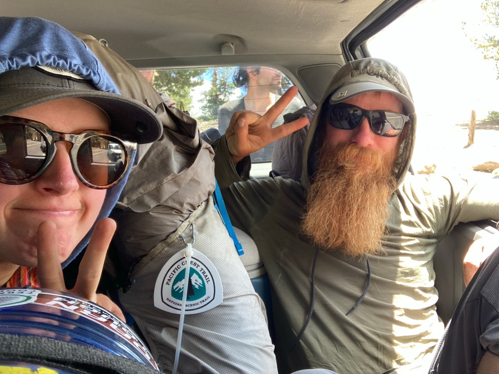 When Tribute gets there, we start hitching. There’s already a group there, and they aren’t having much luck. They go down to try another parking lot while we stay at the crossing. It’s looking like it’s going to be another Onion Valley situation. I settle in, preparing myself to wait for a long time. Then, out of nowhere, a guy asks if we need a ride down to Kennedy Meadows (the North variety, different than the South one. Why are there two? No idea.)There are a lot of people in the SUV already, including two kids, but Tribute and I squeeze in the back while Jumbo and another hiker named Cookie sit in the actual part of the car. It’s a beautiful, if slightly cramped, drive down to the campground and resort in the valley. We thank our drivers, who give us beer and send us on our way.