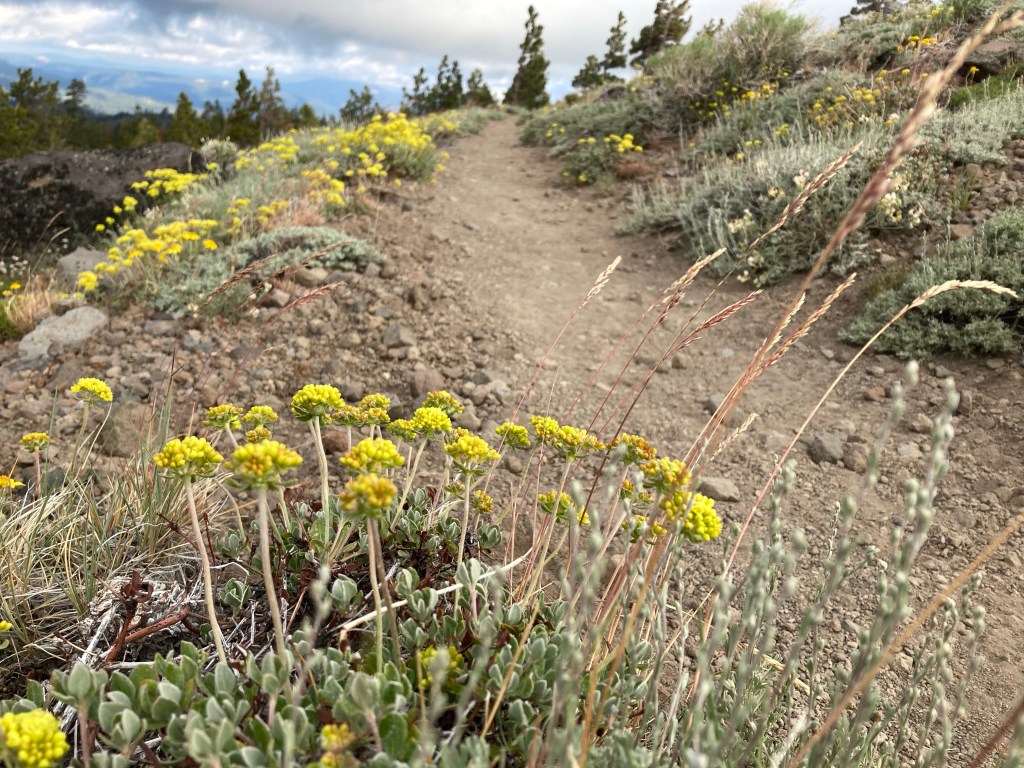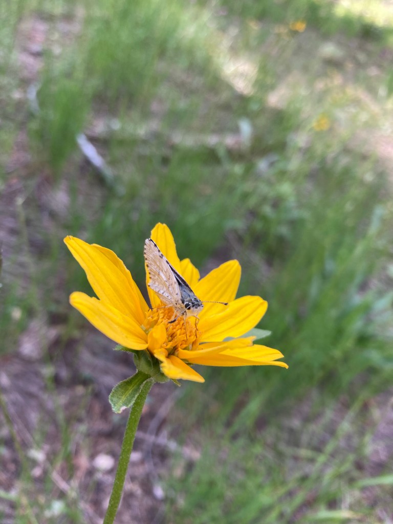 We walk together for a long time after that. The trail keeps oscillating between verdant, fragrant forest and mule’s ears ridges with windy views for days. We stop for lunch at a campsite just shy of ten miles. It’s not even 11 yet, so we take our time. I lay my tyvek on the ground and write for a while, somehow resisting the urge to fall asleep. This is such luxury. Somehow my brain is still in Sierra mode, and it feels weird for miles to be coming so quickly and to be able to relax.