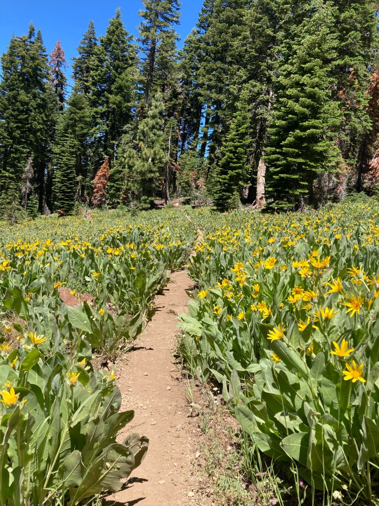 I’m noticing that it takes me longer to get moving in the morning now. For the first mile, my body creaks in protest. I give it gentle mental encouragements, take small steps, breathe. I don’t feel like listening to anything yet. My brain is kind of pleasantly empty this morning and I want to keep that rolling for as long as I can stand. There’s forest, then rocks, then ridges with mule’s ears, then more trees, downhill, uphill, and a huge down.