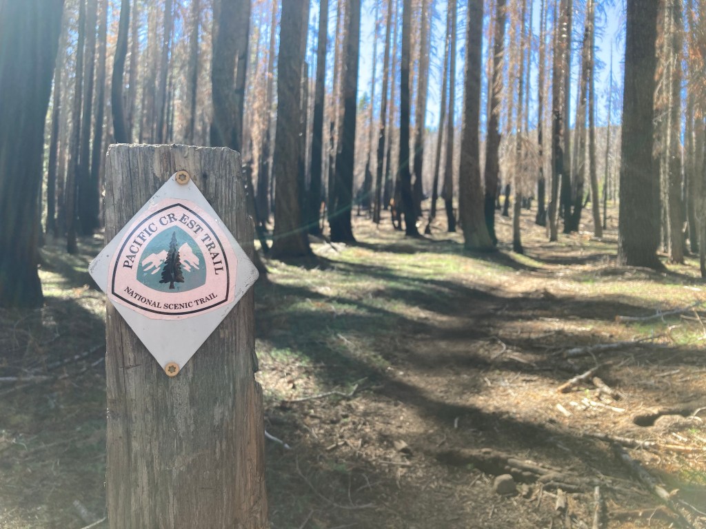 After about ten minutes my quilt is mostly dry. I stuff everything back in my bag and continue through the burn zone. It’s around 4:30, and I still have eight miles or so, but it’s all downhill. I continue with my audiobook for a while, and then the need for a cathole hits me. I sigh, annoyed. There’s hardly any cover, so I have to go all the way up a steep hill and then wrangle the very packed-in dirt. Then when I get back down to the trail, I realize I must have dropped my Kula cloth. UGH. I go back up the hill and comb the entire area, but I can’t find it. I come back down, trying to retrace my steps, but I can’t see it anywhere. So annoying. I lost one on the AT, too. I feel bad for whoever finds it, but I don’t know what else to do, and I need to keep moving. This eats up way too much time from my quickly fading daylight.
