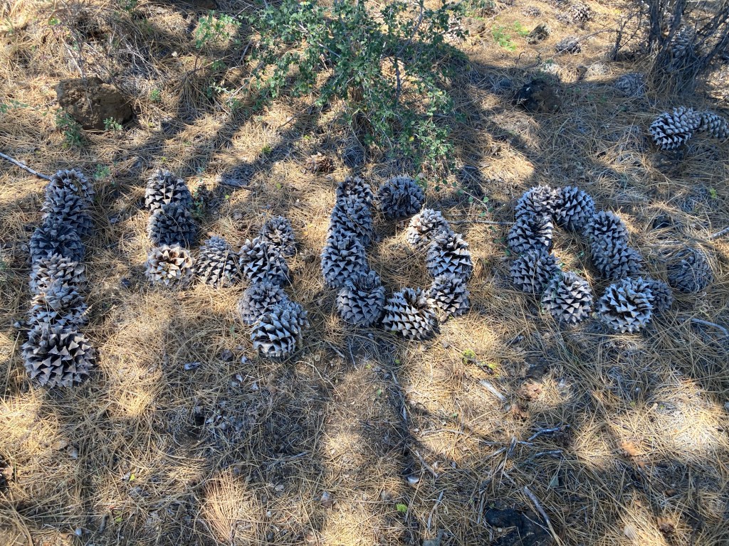 We pass a few hikers going southbound, and as they’re going past us one of them says, “Enjoy the trail magic!” This perks us up. Trail magic? Again? Where? I check Guthook and see that there are a few road crossings coming up. We pass a dirt road, then another, then come near a paved road, but still don’t see anything. Jumbo is apparently inches from expiration now. He goes to stand under the shade for a minute, where we notice some pinecones arranged in a 1400 formation. Woo! Apparently we’ve hiker 1400 miles! But there’s no leftover energy for celebrating right now. After a minute or two, we start moving again.