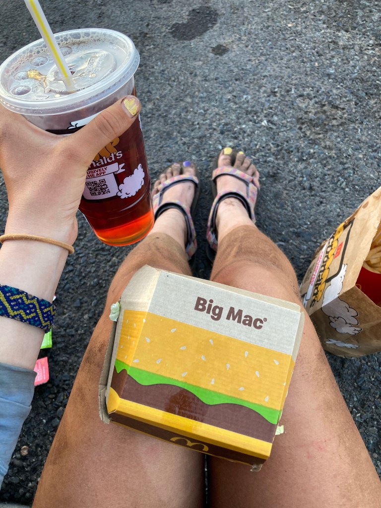 It turns out to be a super nice place, and it reminds me of the many church stays we had on the AT. A man named John (I think) checks us in, scans our IDs, and writes down our trail names underneath each ID photocopy. Then we each put a pin in the map to show where we’re from, and we get a rundown of house rules. After that we make a beeline to McDonald’s because we’re starving. The lobby is closed, so we end up sitting in the parking lot with our dirty legs shoving fake chicken into our gullets. It’s amazing.