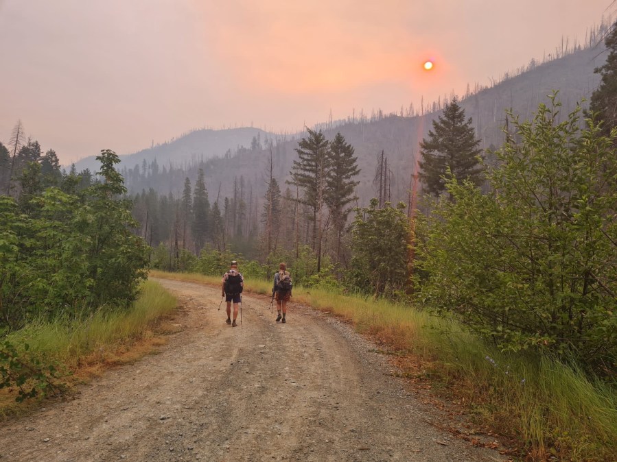 Since we only have six miles, we wake slowly. It’s still cloudy this morning, that pleasant after-rain hangover, and it’s such a nice change of pace from the blaring sun. As we have breakfast, pack up, and start walking down the road, though, we begin to get concerned. The sun is the bleeding orange ball of light that means fire. We haven’t heard about any fires, but then again, we haven’t really had service for the past few days.