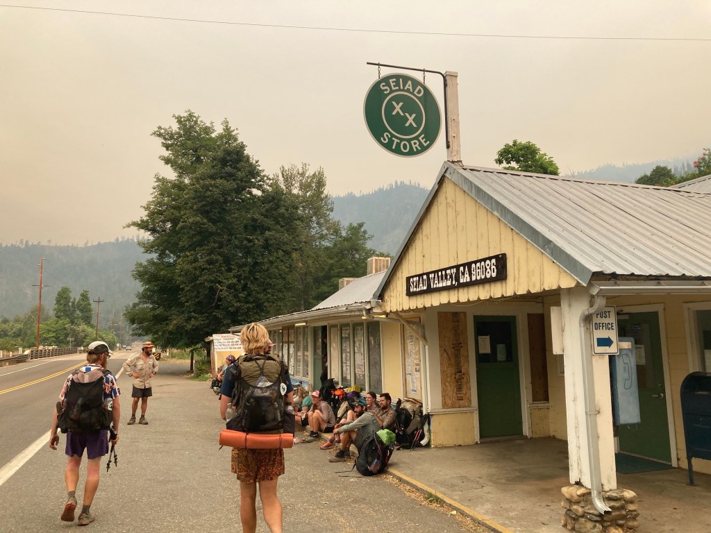 When we get to Seiad Valley, which is deep in State of Jefferson territory, we’re surprised to see a huge horde of hikers outside the store. We roll up and see Gus and Cathole, who tell us that not only is the restaurant closed, but part of the PCT is closed due to a fire. They had hiked up the road a bit and then had to turn around when they saw the fire and realized that there was going to be a closure. Now everyone is trying to figure out what to do, how to get out of town, and where the fire is.