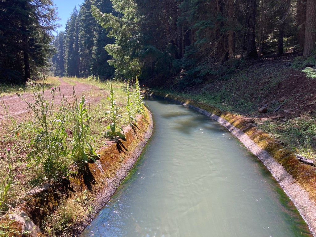 Back on trail, I go downhill and cross a weird little aqueduct full of bright blue fast-flowing water, then see a huge group of hikers a little while later at a spring. It’s been interesting seeing who’s back on trail here and who skipped ahead. At first, it seemed like we were some of the only people who got back on at Ashland, but now there’s a huge group of mostly people I’ve never met before.