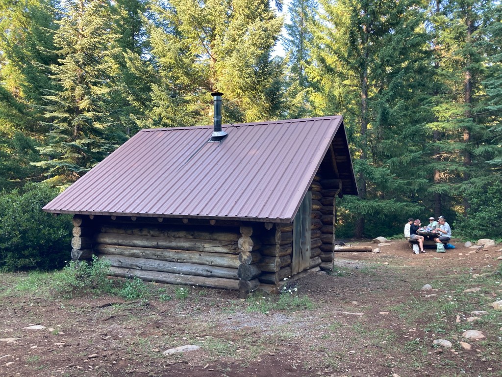 The shelter is a four-sided log cabin type affair with plastic flaps instead of a door—very different than the three-sided primitive AT shelters. There are tons of people here, sitting in the shade of the building, all around the fire ring, at the picnic table. We find a spot below a tree, get some water from the pump (which requires a large amount of effort to dispense water, but at least it’s not a quarter mile off-trail), and cook our dinner there at the shelter.
