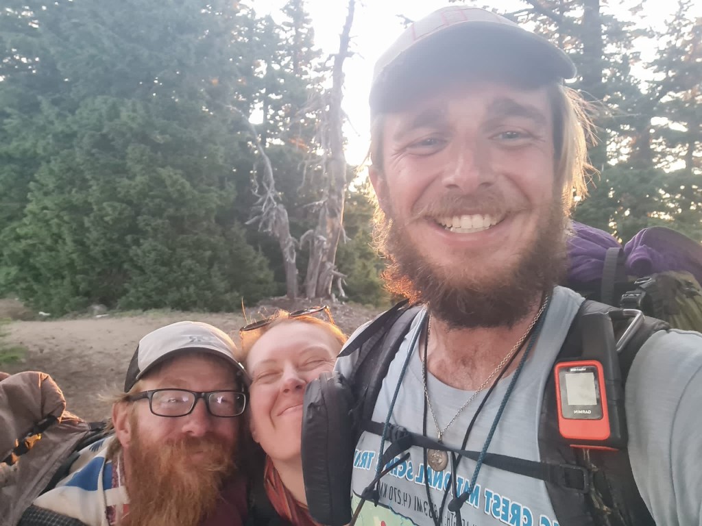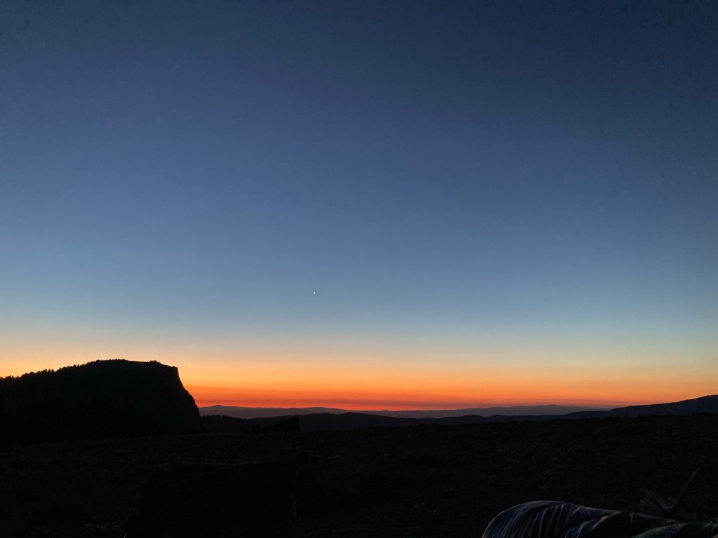 There’s a campsite maybe five miles away that we really need to make it to. We try our hardest, but it’s so late and we’re so done. Just a bit back from this site, we decide to call it quits and find a cowboy camping spot far from the trail and on a durable surface. Plus, cowboy camping is less impact than setting up a full tent, and we’ll be gone by sunrise tomorrow. We squeeze in close together and lie down, looking up at the ridiculously beautiful stars and the Milky Way dancing above. It’s actually cold tonight for the first time in a while, and being in my quilt is comfortable for once. It’s so cozy. Just a trio of little cozy beans out here in space.