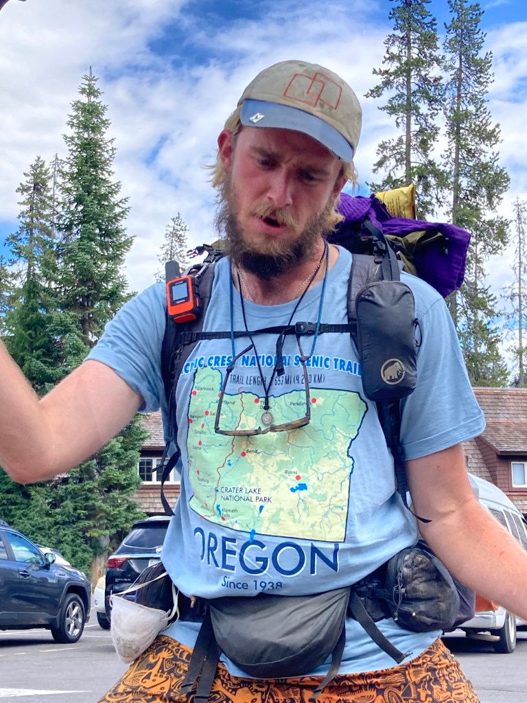 We get to Mazama Village before the restaurant opens. There’s some confusion wherein Jumbo goes in search of a bathroom and doesn’t come back for a while and I realize that he’s at the shop where we have to pick up our boxes. So I go over there, get my box (which mercifully arrived yesterday even though it was supposed to come today), and check out the swag in the shop. I love a good National Park gift shop and visitor’s center, and this one has a good selection of things I probably don’t need but am definitely going to buy. I wind up with a lovely maroon Pacific Crest Trail shirt with the logo on the front and a map of the whole trail with major milestones. It’s very cool. And very expensive. But worth it. Jumbo, meanwhile, delights in buying the cringiest touristy Oregon t-shirt he can find. It has an extremely detailed map on it, which he delights in using to demonstrate where we are in the state.