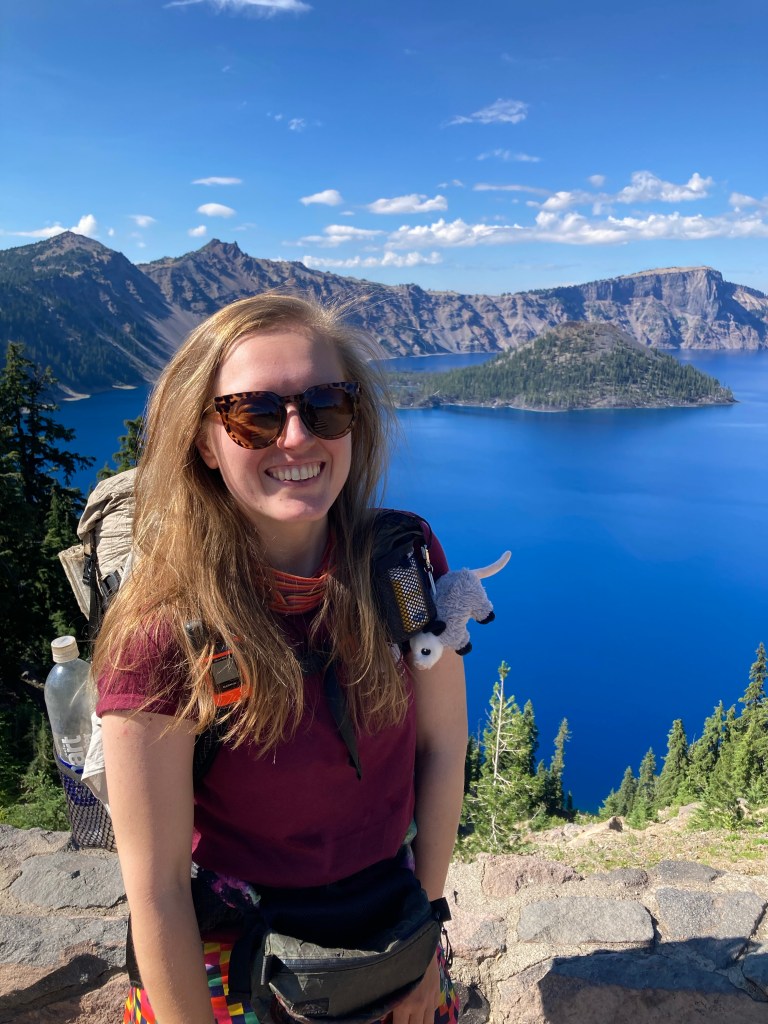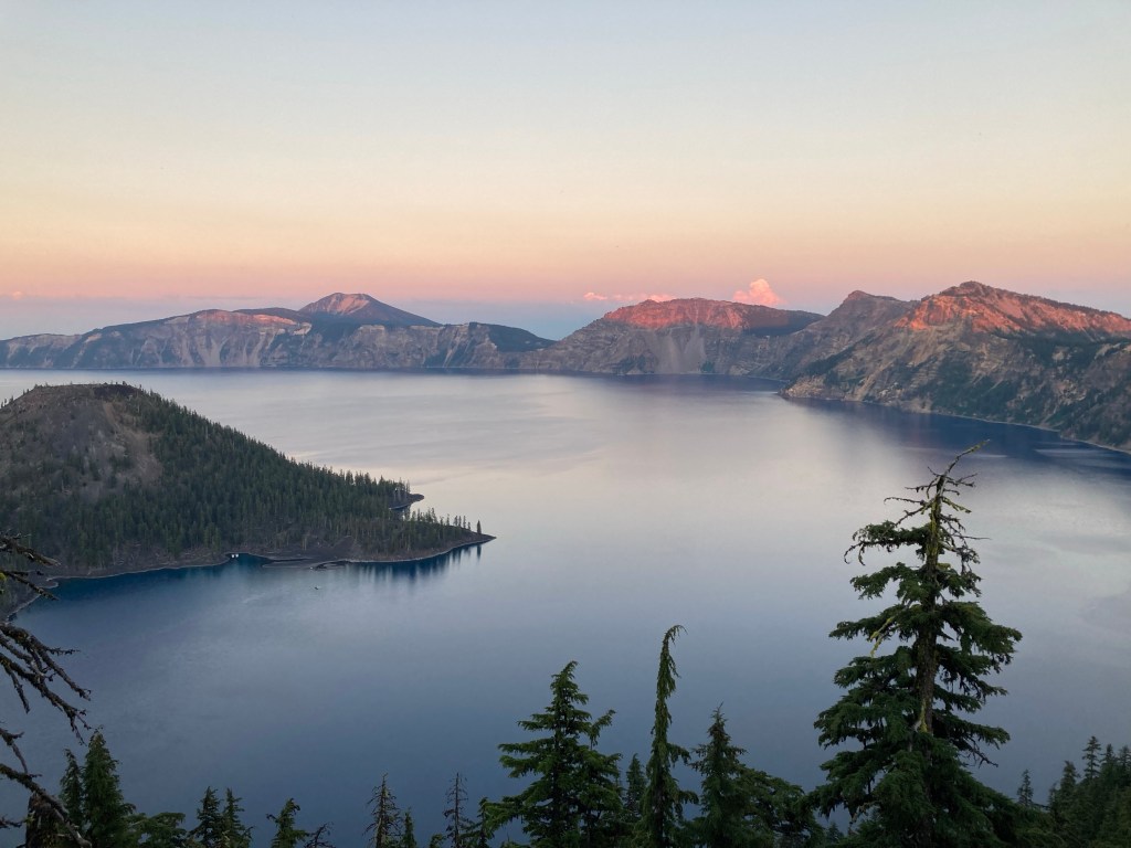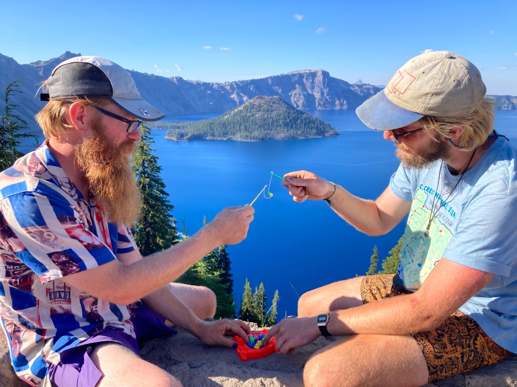 Crater Lake is one of those places whose scale cannot be fathomed until you are there in person. It is so massive, so blue, with steep walls that plunge from the rim to the surface below. We stand there in awe for a few moments, get some folks to take our photo, and then go to the Rim Village store for ice cream. Listen, don’t at me. I’m apparently in serious need of sugar today. We try to go to the little visitor’s center, but it’s closed, so we just pop into the lodge for a minute and then get back on the rim. We’ve packed out a few beers for this evening, and we keep them handy for a good spot.
