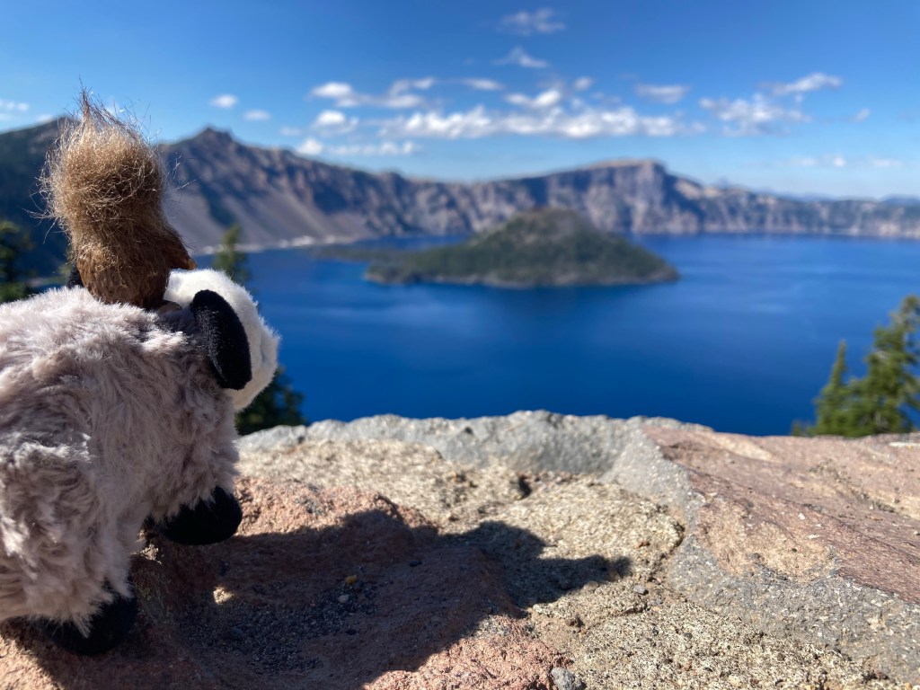 We pass another good viewpoint and pose for more photos. My hair is down because I’ve just had a shower, and I feel like I look pretty great. Tribute takes photos of Samuel the Sasquatch, and then I add in Petunia and our mascots have their little adventure photo shoot. Then Tribute pulls out his little plastic fishing game and he and Jumbo play on the rim of Crater Lake while I film. It is excellent.