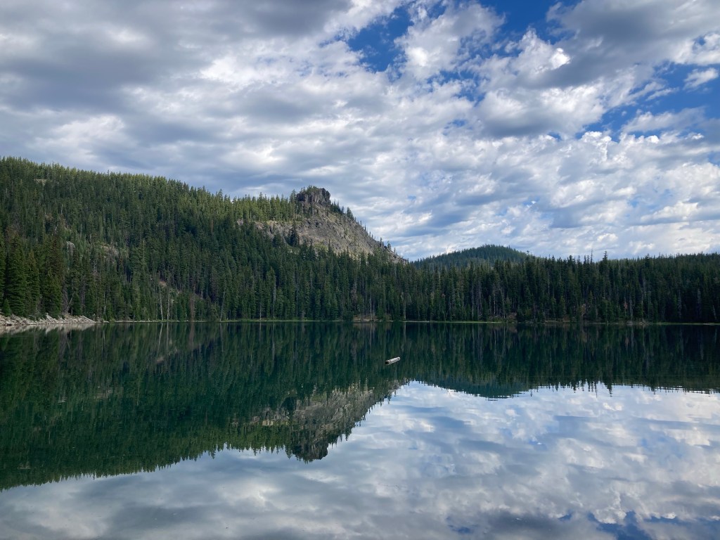 Around 4, I stop at Charlton Lake. Jumbo and Tribute are there, and since we only have a cool five miles left before camp, it looks like we’re settling in for a good break. There’s a log just next to the shore, perfectly perched there for soaking our feet. We sit there feeling the cool water wash over our skin while we enjoy the wide view of the lake. At first it’s a little smoky here, but then a breeze rolls in and everything is totally clear again.
