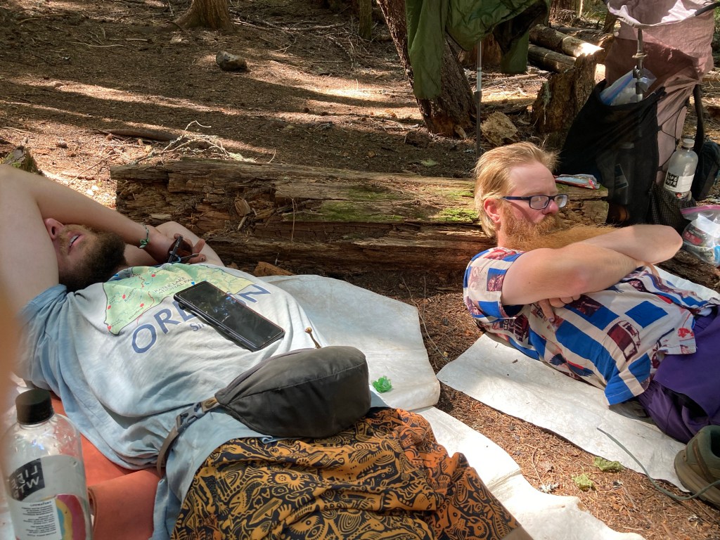 I’m feeling slow this afternoon, so I walk behind the others for the last climb of the day and then the long descent to Timothy Lake. I listen to more of my book, then switch to the new Sylvan Esso album to help me up the hill. I like some of the songs right away, but a few seem like they might need a few listens before I decide how I feel. Once I start going down again, I switch back to the book, but I still have an hour left when I get to a water source and wind up taking a break.