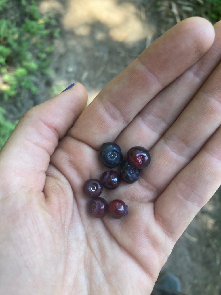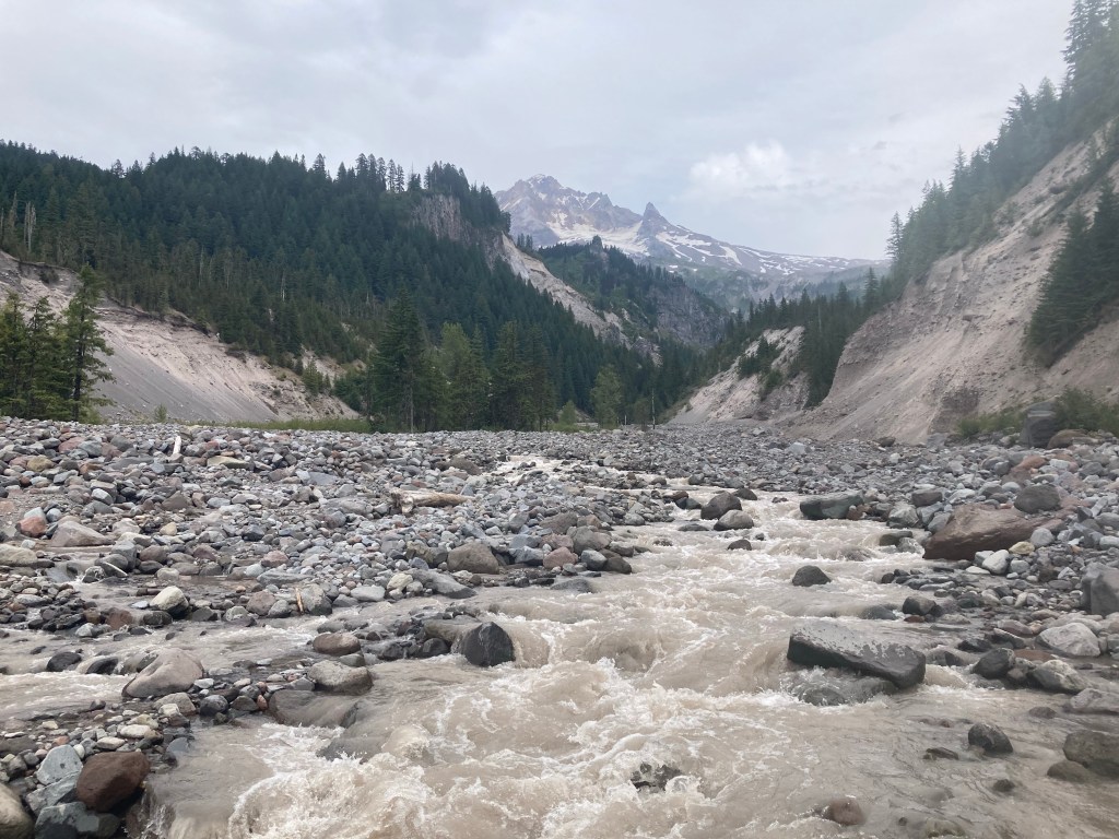 The trail hugs the sandy shoulder of Mt. Hood for most of the day, going around little canyons and opening up into frequent mindbending views of the mountain. I cross the silty Zigzag River and then turn uphill. Tribute texts us saying he’s taking an alternate route, and when I get there I look at the map and decide to just keep going on the PCT. There are huckleberries all over the side of the trail, and I get totally absorbed in looking for the juiciest, purplest berries I can find.