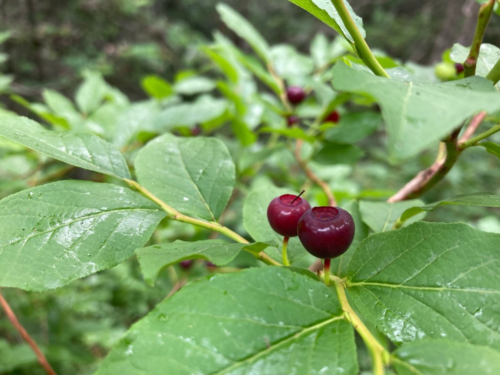 Today is almost entirely forest ridge walking. We get occasional views back to Hood, but mostly, it is foliage. I’m ahead of Jumbo at first, but he gets impatient with me picking every single juicy huckleberry I see an zooms on. Meanwhile, I’m lost in my huckleberry world and I put on my audiobook. Um, hello. I love this book, The Cat Who Saved Books. It’s like Miyazaki meets Neil Gaiman meets Murakami.