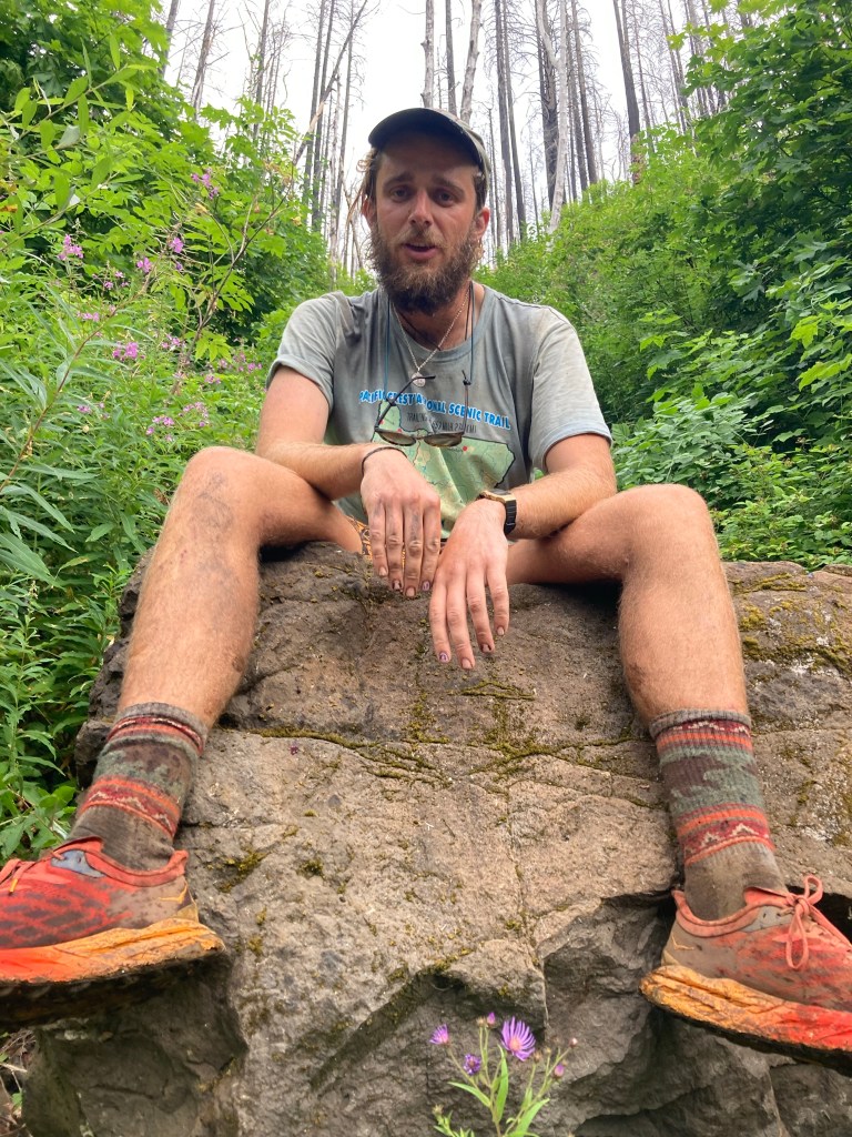 In the afternoon, we take the Eagle Creek alternate, which is more popular than the actual PCT through this section because it passes by the infamous Tunnel Falls. The trail itself isn’t great at first, though. It’s a very steep downhill in a burn section, and the ground is loose, ashy, and full of trippy roots. We are very over it by the time we get to the water source and take a break. A very out-of-it Jumbo climbs up onto a rock above the water, Golem style. I pick some blackberries on a nearby bush and try to muster the energy to keep going, which is not usually a thing I have to do on a downhill.