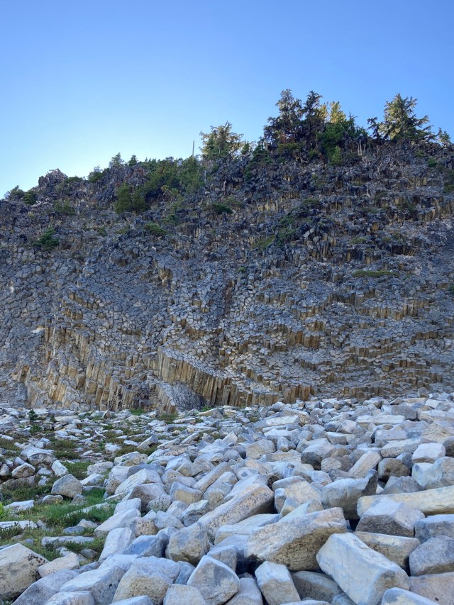 It’s another mile to Cispus Pass, but it feels like much less because the ridge is completely exposed and there’s nothing but views. I enter a section in shadows and look up to my left to see a wall of rock that has the same hexagonal lava flow formation as Devil’s Postpile. Then, to my right, I hear the high-pitched beep of a pika.