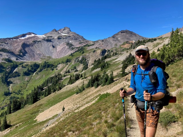 Speaking of good things, the view at the crest of the hill is genuinely breathtaking. We’re technically in Goat Rocks Wilderness now, and we’re facing a ridge that contains several rocky peaks with names like the Goat Citadel. The scope of these mountains is Sierra-like, but with their own character. I stand there and take it all in.